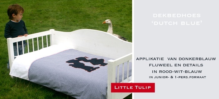 Op dit zachte overtrek is donkerblauwe boerenruit gecombineerd met puur wit. De applikatie van donkerblauw fluweel heeft een subtiel accent van glansdraad in oranje rondom. Afgewerkt met band in rood-wit-blauw. Met mooi detail op het bijpassende kussensloop.