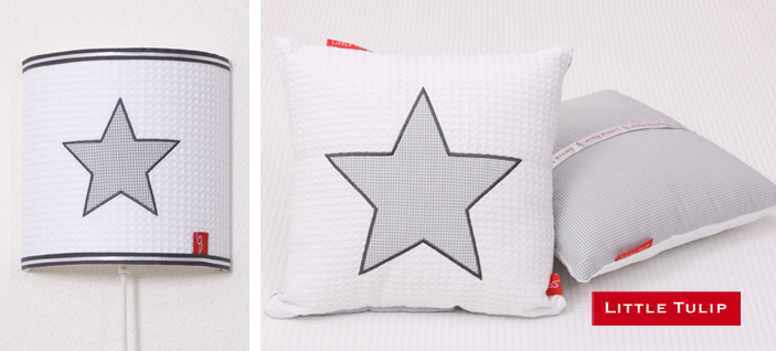 Fijn kussentje van witte wafel met applikatie in grijze mini ruit. Achterzijde van grijze miniruit. Met opbergvakje voor de favoriete knuffel.